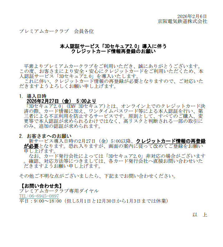 プレミアムカークラブに本人認証サービス「3Dセキュア2.0」が導入されると聞いたが?